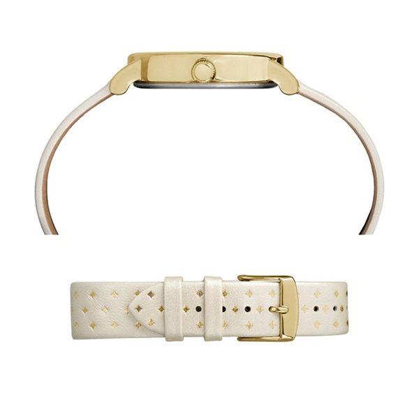 Chiếc đồng hồ được thiết kế với dây đeo bằng dây da trắng 18mm có hoa văn kim cương vàng.