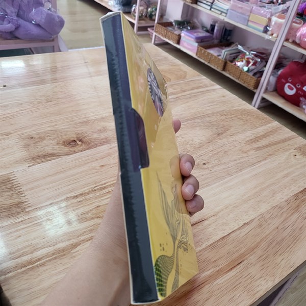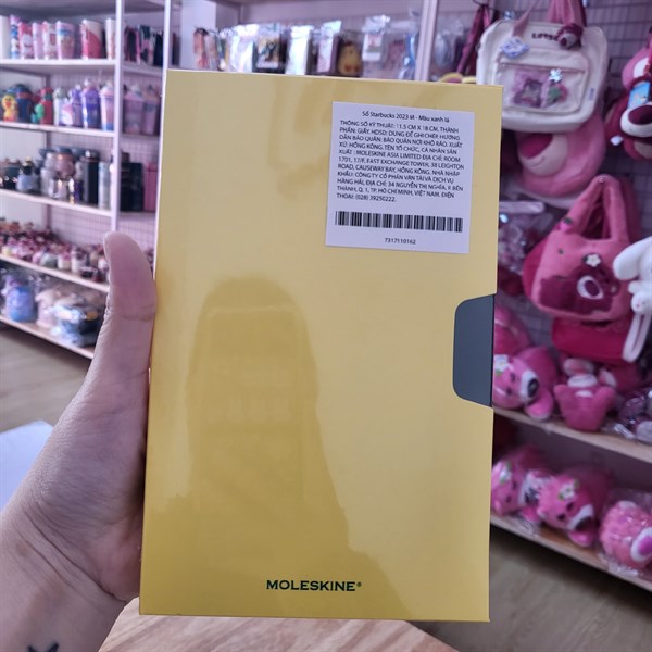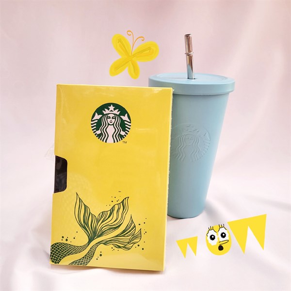 Quyển sổ có bìa màu xanh, vỏ vìa màu vàng họa tiết đuôi cá kèm logo Starbuck trông thật bắt mắt và sang trọng.