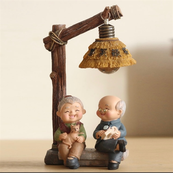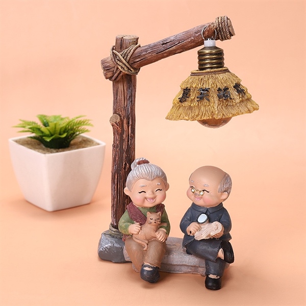 Tượng ông bà ôm mèo dưới đèn